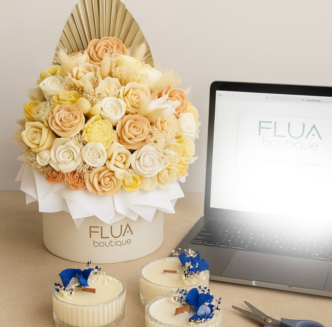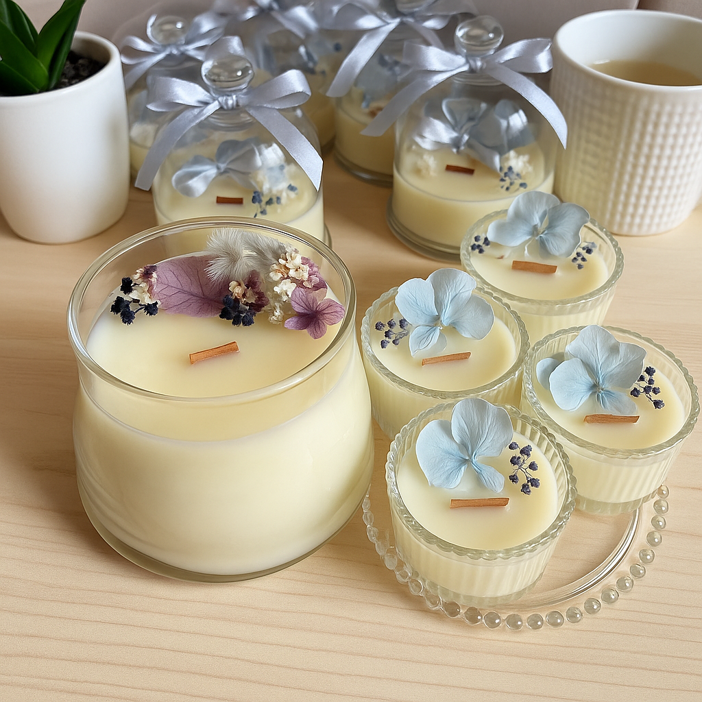 Qui trovi tutto ciò che ti serve per creare candele uniche: cere naturali, contenitori eleganti in vetro, fragranze, scatole in velluto e fiori essiccati.